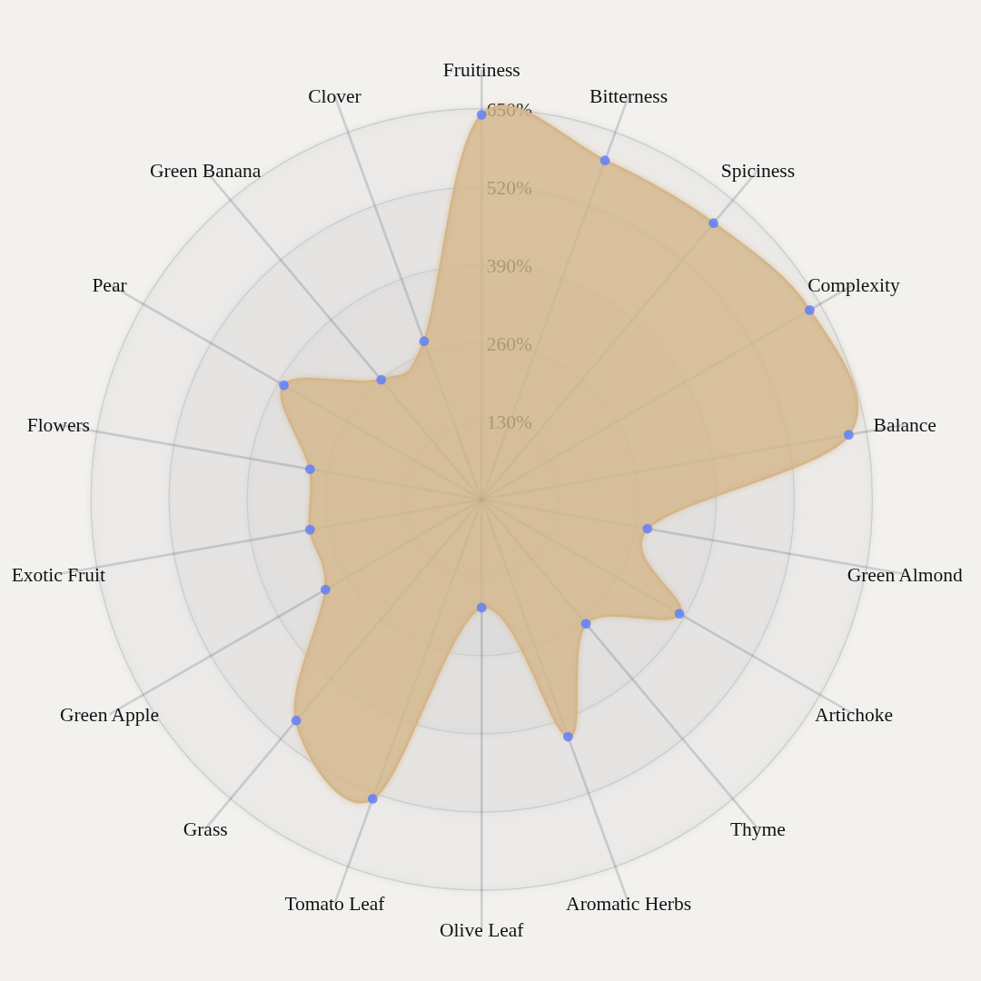 The panel described our oil as fruity, bitter, and peppery. Its aroma carries vibrant notes of grass, tomato leaf, artichoke, and wild herbs, reflecting the landscape where our olives are grown. The result is an oil that is highly balanced, complex, and free from defects.